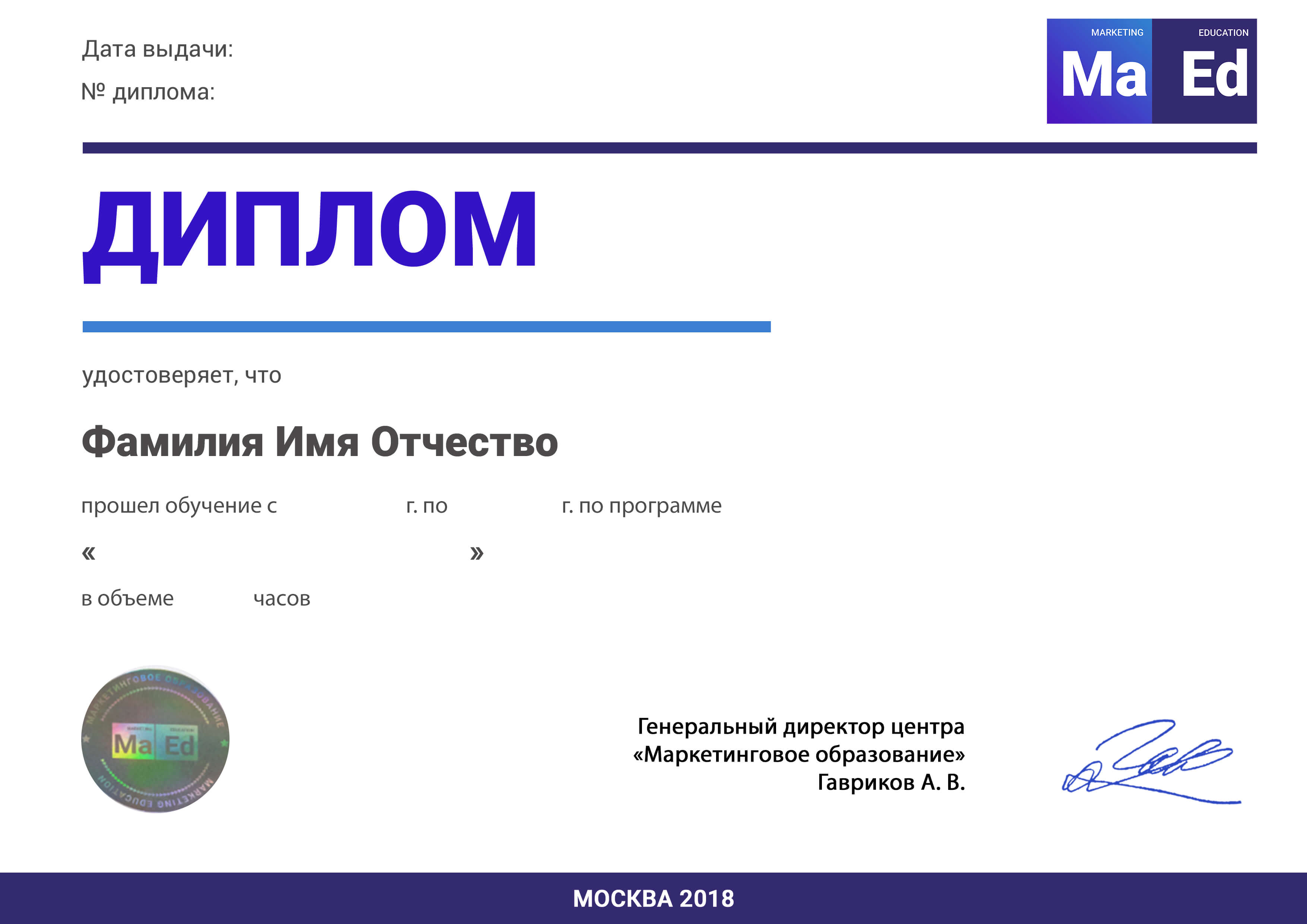 После двух дней практикума всем раздадим официальные дипломы от учебного центра «Маркетинговое образование».